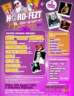 shaft is back vs hardfezt fri 10th aug http://www.dontstayin.com/uk/worcester/2007/aug PLEASE CLICK THE LINK ABOVE AND COME JOIN THE PARTY Hardfezt VS Shaft 10th August 2007-07-07 @ Evolution, 57-59 Lowesmoor, Worcester, WR1 2RS On the 10th August 2007 Hardfezt puts there stamp on the hard house scene by going head to head with the legendary after party Shaft. Hardfezt is the brainchild of Talia Kapinski, a single mother of 2 that gained her big break by winning a DJ’ing competition at Turnmills nightclub in London. After the first successful night in May 2007 that included high profile DJ’s such as Andy Farley and Nick Rafferty, Hardfezt is moving on to bigger and better things. Since the first event Chewy and Col The Medik joined the Hardfezt Crew, being actively involved in the promotion and running of the night. For those of you whom have barely touched the hard house scene Shaft, ran by Col The Medik and Mark H, was THE best and the ONLY after party to be at on a Sunday. Shaft worked alongside super clubs such as Sundissential, Polysexual, Godskitchen and B2T but to name a few. Between the hours of 10pm & 4am you will be presented with the amazing Billy “Daniel” Bunter. Billy, with 19 years of quality experience under his belt will delight you with those tunes you hear at Tasty, Raindance and Honeypot. Also to tempt you will be Polysexual Resident Mark H co-founder of Shaft. Mark is now a very well recognised DJ. Mark played at global gathering last year and is also set to get their hearts pumping this year as well. His unique style will be sure to fill the dance floor with his uplifting sound. Next on the list come the Strangest of the strange – Strange Dave. As well as being a Sundissential Resident for 5 years he is the founder of one of Birmingham’s finest nights, B2T, along with partner in crime Livewire. Dave has played at Shaft on numerous occasions and never fails to deliver a fully loaded performance!!!! Col the Medik needs no introduction, his uplifting style gets the crowd rocking every time. Being the co founder of Shaft he is well recognised within the Hard Dance scene, Col is a perfectionist and pays particular attention to the crowd and what they want. This is one not to miss. Paul F, newly appointed shaft resident &upcoming future hero, as quoted by the hardest working man on clubland Vince Robertson, will be showcasing some of the freshest Hard Trance to grace the scene yet. His production is second to none and always delivers! He will be unleashing some of his new tunes that will leave you begging for more! K.I.R.K DJ will be bringing you the sound of B4 a predominantly Birmingham based night. This set promises a sound so immense it guarantees to leave the hairs on your neck standing on end! JK-3Style & Moggsy will be hosting Hardfezt’s corner. These 2 upcoming fresh new faces assure a night of bouncy madness and fun filled entertainment as they unleash upon you 60 minutes of mayhem! Electro City will be hosting room 2 as we listen to the sounds of Hardfezt’s founder Talia, DJ Mistrix, Dropzoe resident Stu Exall, DJ Gary, DJ Nicole, Electro City’s own resident Dan Appleton and to tantalise you even further Tomas Ruebeck will be perfoming a LIVE P.A for our aural pleasure!!!!!! We also have the enticing Flava UK Dancers on the night “The Flava Babes” Flavauk is the brainchild of andy and lou. They have followed their dreams and now flava is going from strength to strength. – check them out on www.dontstayin.com/groups/flavauk As always there will be DRINK PROMO’S. All bottles £1.50 and Shots £1!!! Get In!! Advance tickets are £7.50 – Door entry is £10 – R.O.A.R Over 18’s Only. I.D will be required if your lucky enough to look under 21! Tickets or any extra information can be obtained by emailing Hardfezt@hotmail.co.uk or by telephoning 07790276594 / 07776002793 / 07881623316. And to kick it all off in a way that only Shaft knows how, The Brewery Tap will be hosting the pre party from 6pm-10pm!!!! DJ’s will include: Kye Shand b2b Paul F Adee b2b The Backwards Man Chris Sharkey b2b Dean Toney Scotty X b2b Chadwick